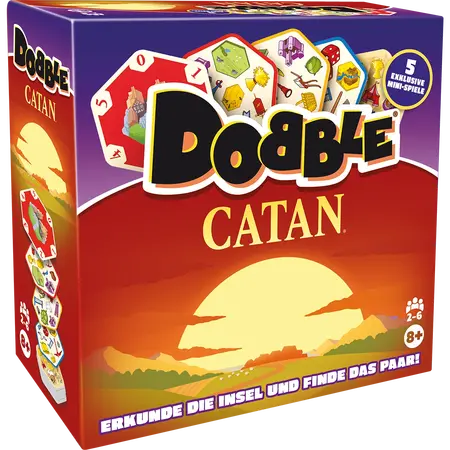 Erweitert euer Gebiet, übernehmt Häfen, baut Handelsstraßen… Ihr spielt alle gleichzeitig – einzeln oder in Teams. Finde so schnell wie möglich das übereinstimmende Symbol zwischen deiner und einer auf der Insel ausliegenden Karte, um sie auszuspielen. Blockiere die anderen mit deinen Karten, bevor sie dasselbe mit dir tun! Alle spielen gleichzeitig – einzeln oder in Teams. 5 exklusive Mini-Spiele.Lustig und rasant – Dobble CATAN ist der Party-Kracher für alle CATAN-Fans!